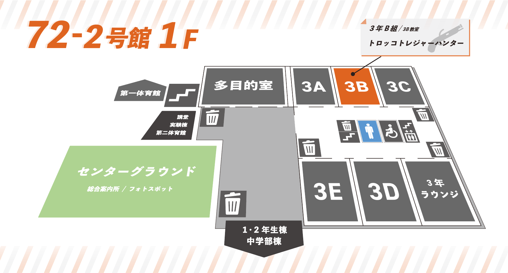 3年生3年B組トロッコトレジャーハンター 企画詳細トロッコに乗ってシューティングゲームに挑戦!昨年、賞を獲得したコーヒーカップの製作技術を応用したトロッコに加え、デジタルも融合した3年間の集大成です!活動場所