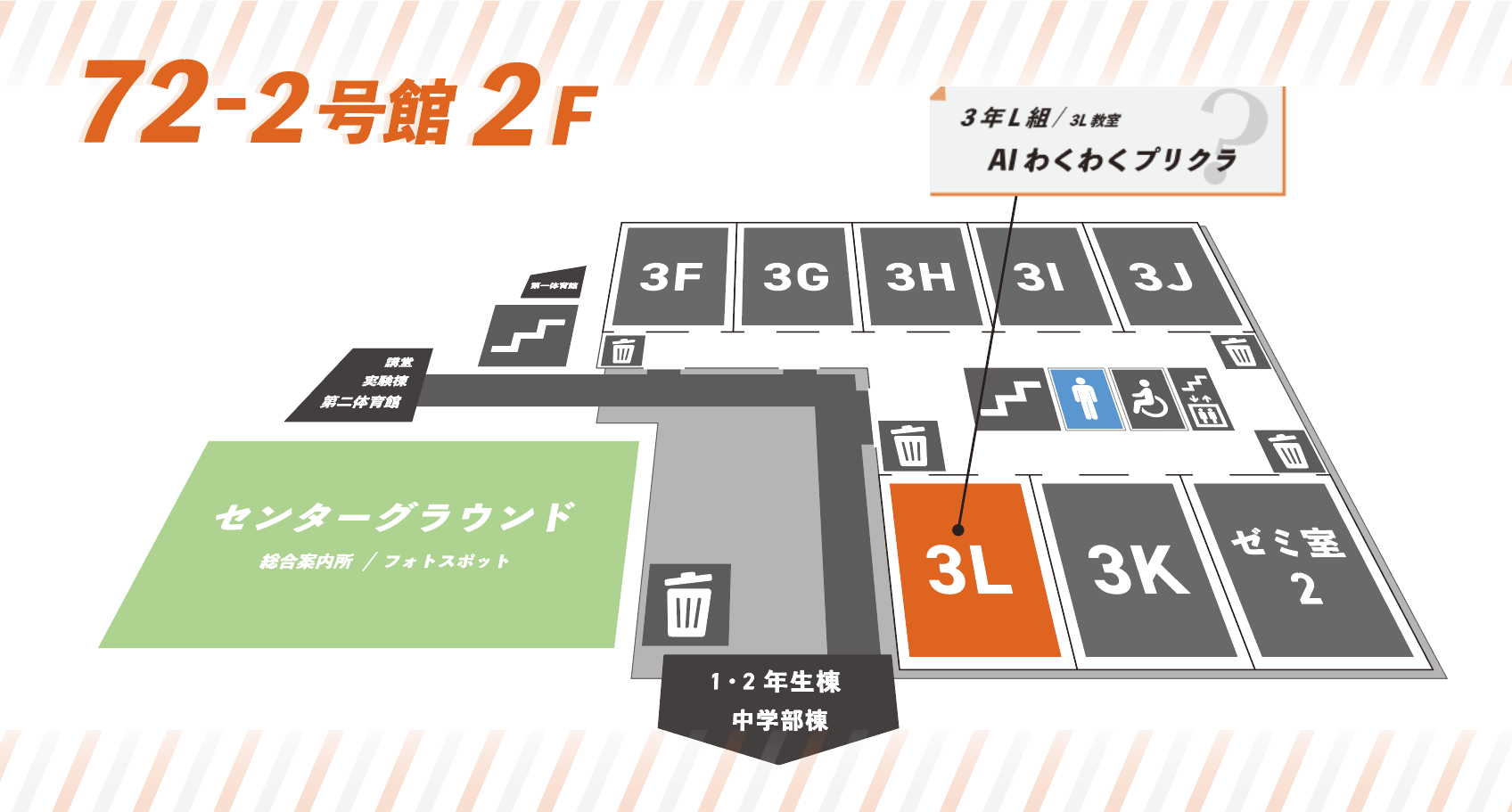 3年生3年L組AIわくわくプリクラ 企画詳細全てのプログラムを自分たちで創ったオリジナルプリクラ!「エレベータープリ」「韓国プリ」「ChatGPTプリ」の3種類を用意!学院祭限定の特別な一枚を!活動場所