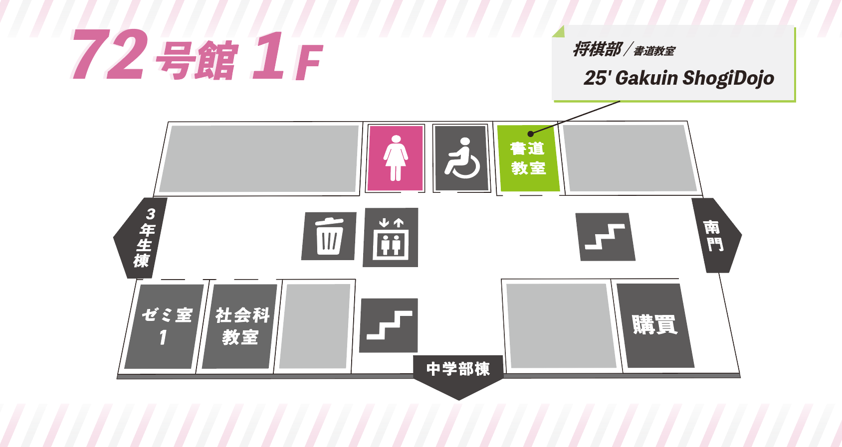 その他将棋部25' Gakuin ShogiDojo 企画詳細2日限定の「展示併設型将棋道場」! 対局、詰将棋、トーナメント、展示、四段との指導対局… 強くなるヒントがここにある。興味のあるキミ、書道教室に急げ!活動場所